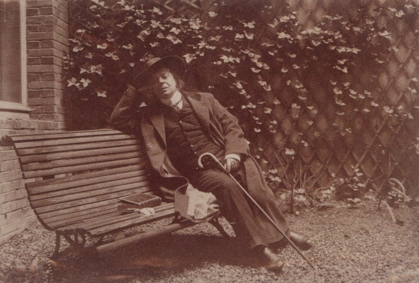 Henry de Groux sur un banc, photographie par Paul Marsan, dit Dornac, 11,5 x 17 cm, non daté (vers 1925). Collection L'Atelier Symboliste.