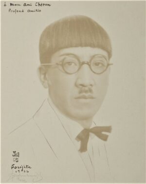 Léonard Tsuguharu Foujita est réputé pour ses représentations de jeunes femmes, d’enfants, d’animaux, mais aussi de paysages et de nature morte. L’utilisation du blanc, d’une ligne fine et d’une forme de perspective aplatie est caractéristique de ses huiles sur toile. L’artiste prépare sa peinture à l’huile blanche avec des colles animales et du gesso, donnant à la couleur un éclat mat comme l’ivoire.