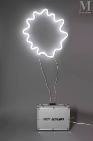 Ses luminaires sont particulièrement originaux, puisqu’il s’agit d’appliques murales en tube de néon de forme rosacée, accompagnées d’une mallette en aluminium sérigraphiée.